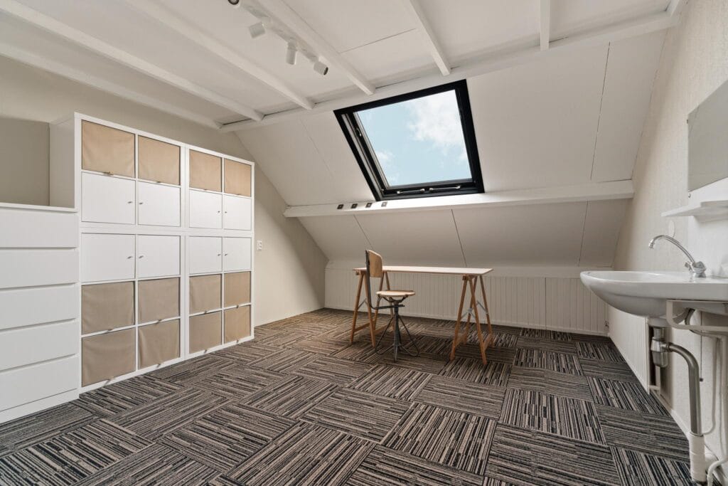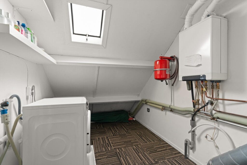 De tweede verdieping verrast met nog meer ruimte. Hier vind je een overloop die leidt naar een riante kamer, momenteel in gebruik als opbergruimte maar ook perfect in te richten als extra slaapkamer. De kamer heeft veel potentie en wacht op jouw creatieve invulling. Daarnaast is er een aparte wasruimte, praktisch voor het wasgoed en het opbergen van schoonmaakspullen. En niet te vergeten: de vliering. Een handige plek voor spullen die je niet dagelijks nodig hebt, maar wel binnen handbereik wilt houden.