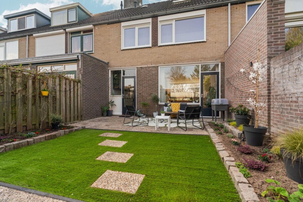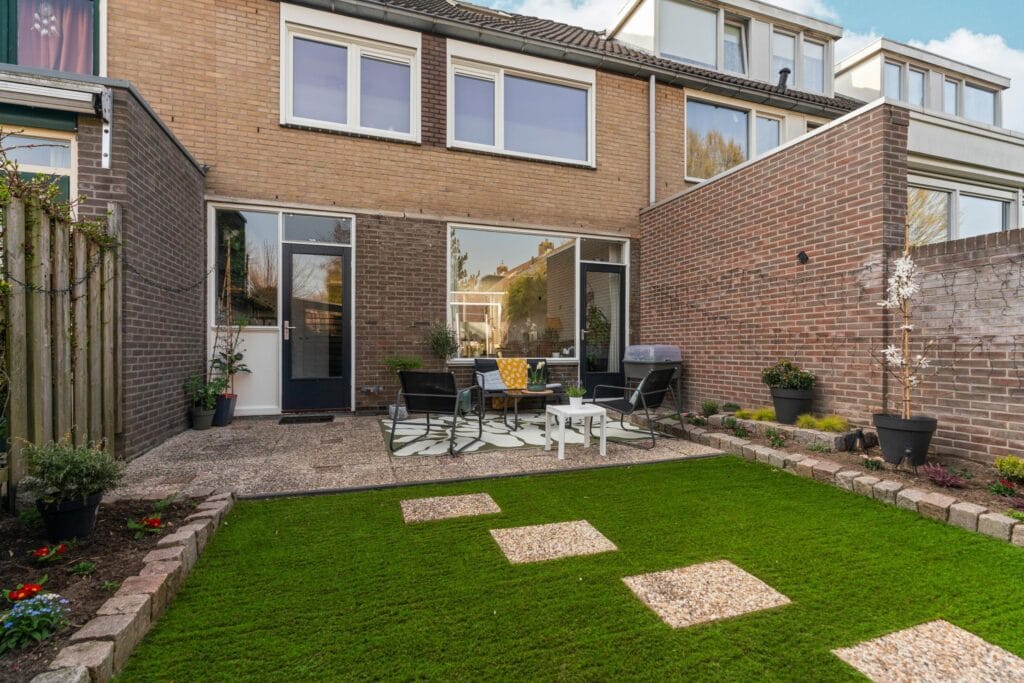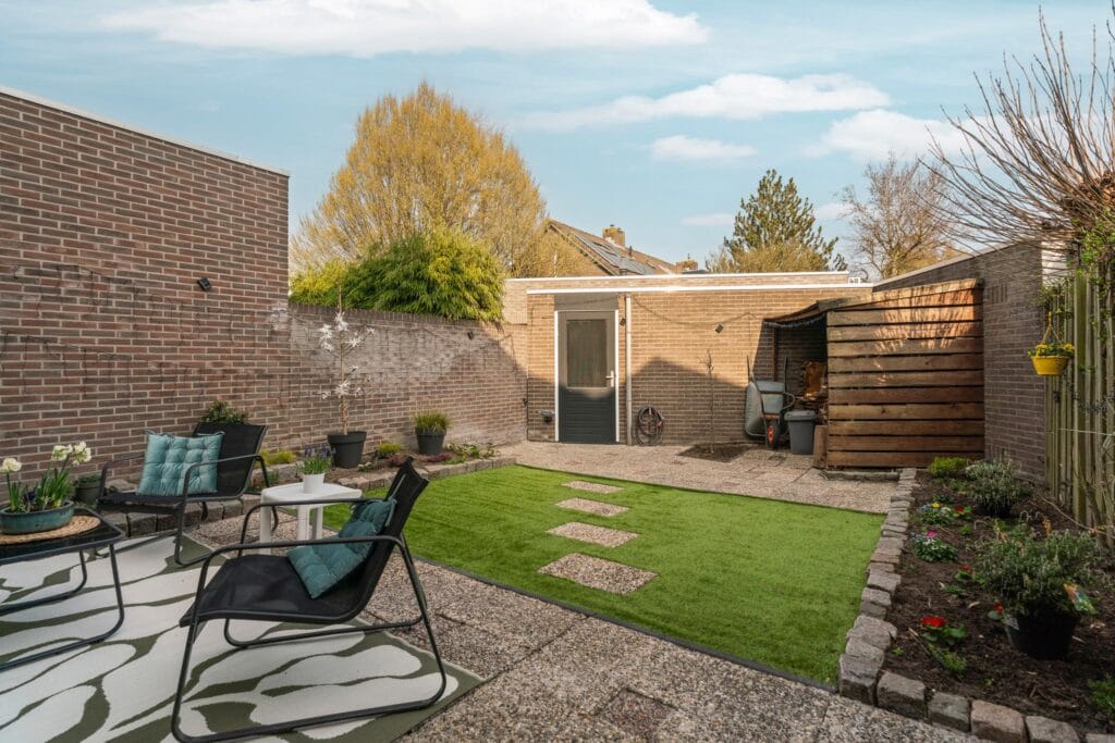 De achtertuin ligt op het oosten en biedt je elke ochtend tot ongeveer 16.00 uur een zonnige plek. Met een diepte van zo'n 7 meter kan je hier mooi uit de voeten: relaxen, spelen of tuinieren, alles kan. De inrichting met zowel groen als tegels maakt het praktisch en sfeervol tegelijk. Achter in de tuin staat de garage met carport, makkelijk voor je auto of voor extra opslag.
