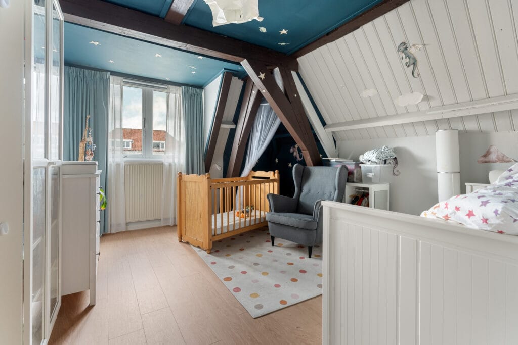 De vloer is mooi afgewerkt: klik-pvc ligt in de slaapkamers en woonkamer, terwijl in de hal, gang, het toilet en de badkamer een stoere stenen vloer ligt. De vide daarentegen geeft met hout en laminaat een speels accent. Kortom, het appartement biedt je een smaakvolle én praktische indeling.