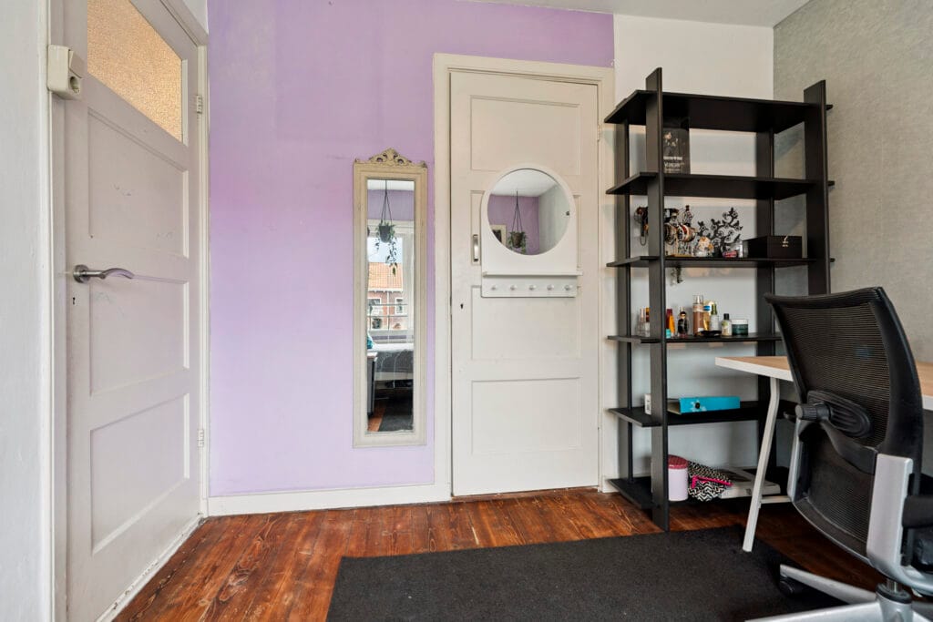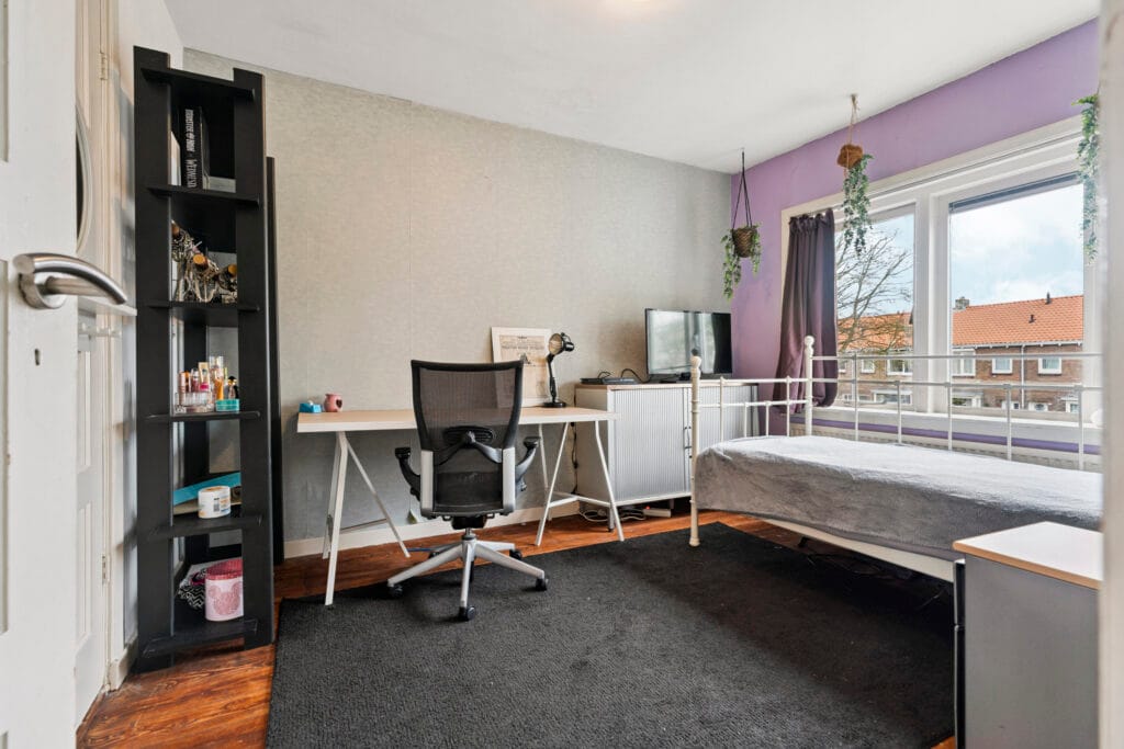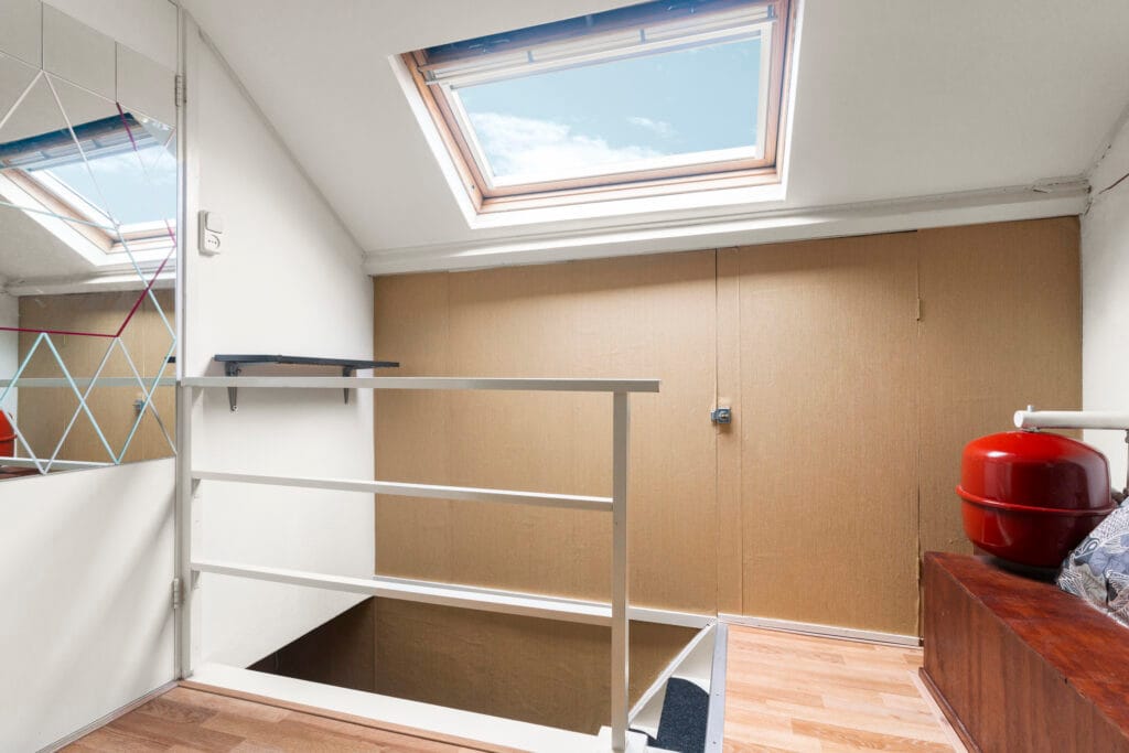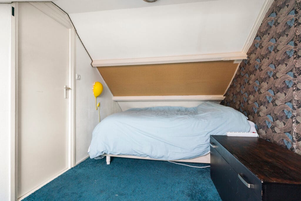 De tweede verdieping biedt een verrassend ruime vierde slaapkamer, mede dankzij de grote dakkapel die niet alleen zorgt voor extra licht, maar ook voor meer praktische ruimte. Hoewel de stahoogte van 1,97 meter niet officieel meetelt in het gebruiksoppervlak, is deze kamer ideaal als logeerkamer, thuiskantoor of hobbyruimte. Met het extra daglicht en de slimme indeling heb je hier volop mogelijkheden. Daarnaast is er ook nog ruimte voor opbergmogelijkheden, zodat je al je spullen netjes kunt organiseren.