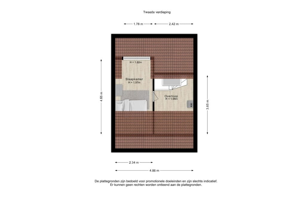 - De slaapkamer op de tweede verdieping is 1.98m en mag hierdoor niet officieel meegerekend worden als woonoppervlakte.
