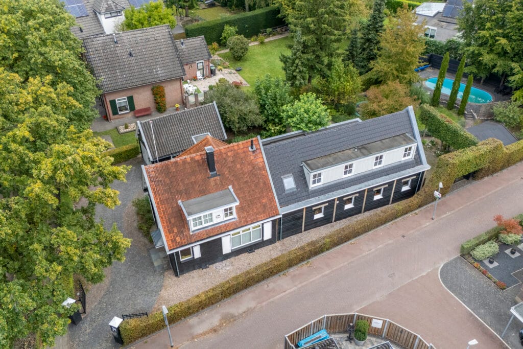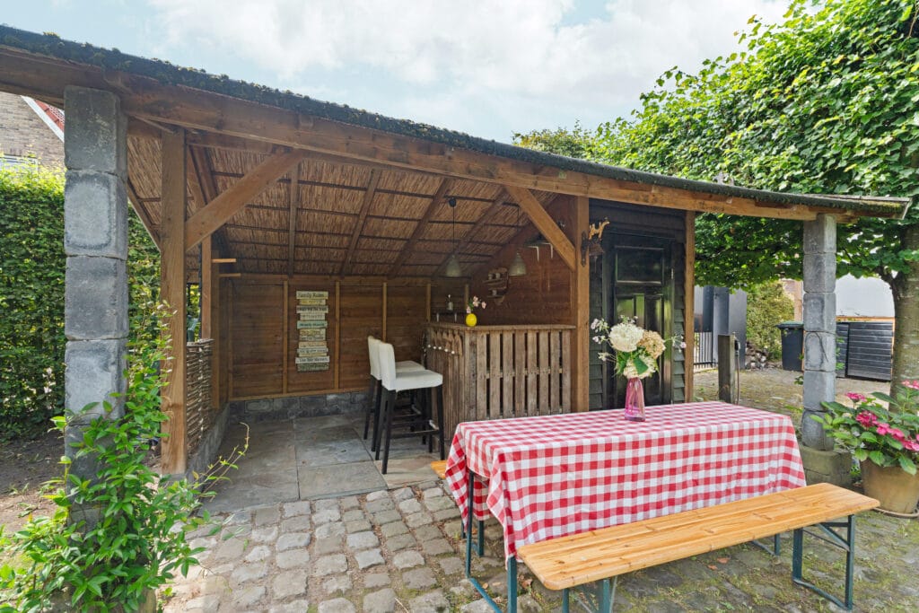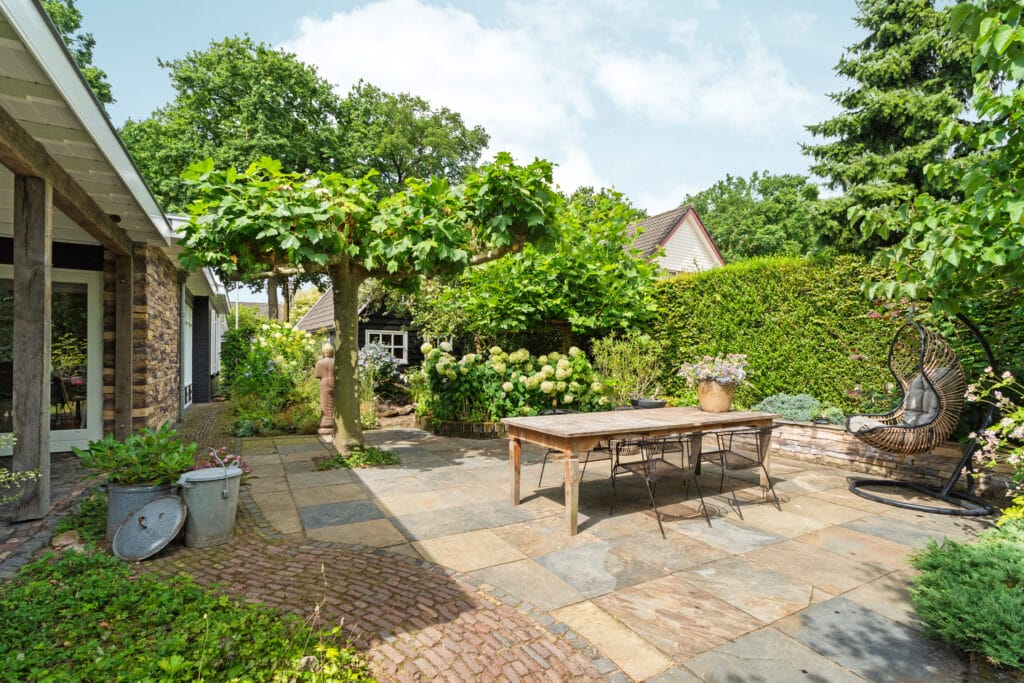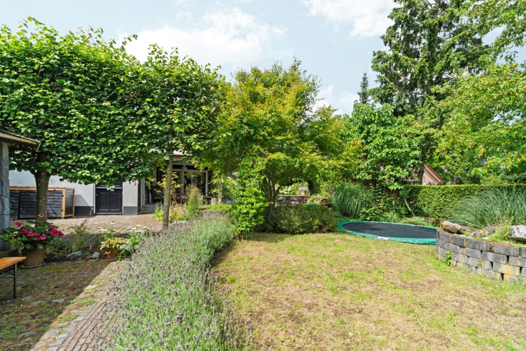 Naast de veranda is een overdekte bar met aangrenzende berging – perfect voor feestjes of als praktische opslagplek. Achterin de tuin zijn speelplekken ingericht, waaronder een trampoline en speelgazon, ideaal voor kinderen. Voor autoliefhebbers is ook aan alles gedacht: meerdere parkeerplekken op eigen terrein zijn bereikbaar via vier toegangspoorten, allemaal stijlvol in lijn met de landelijke woning.
