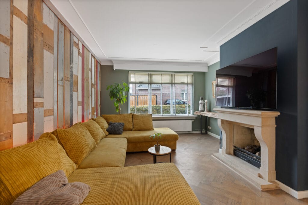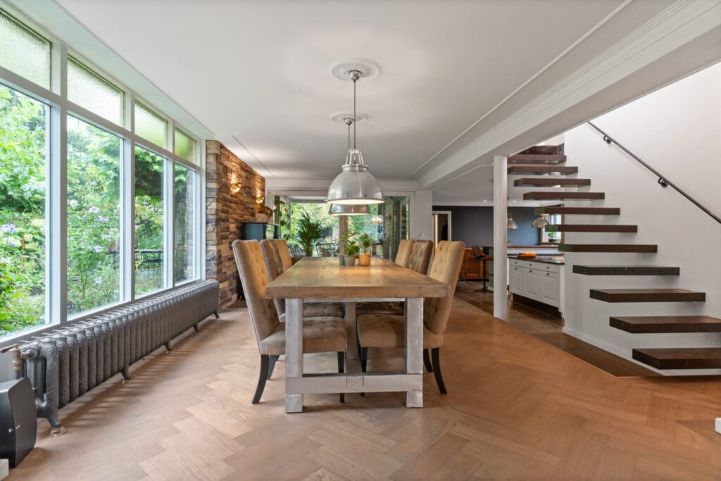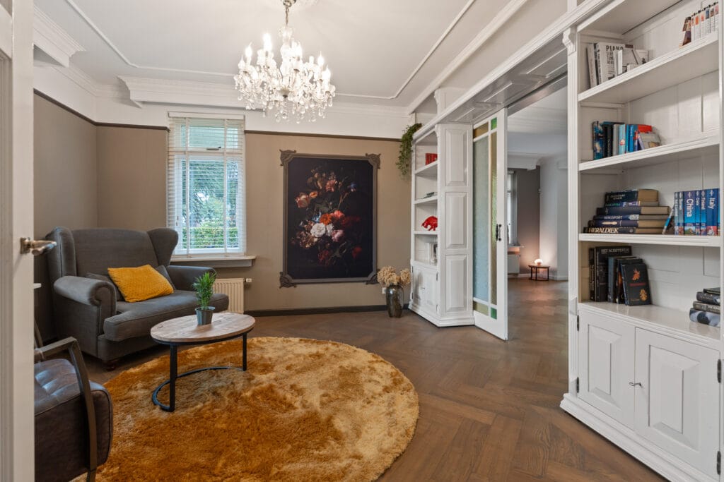 De woonkamer is sfeervol en ruim, voorzien van een warme eiken visgraatvloer, en een open haard die een echte blikvanger is. De aangrenzende eetkamer biedt plek voor een grote eettafel en heeft, net als de keuken, schuifpuien naar buiten. Het hoge plafond en de grote raampartijen zorgen voor veel lichtinval. Schuif via de prachtige glas-in-lood-deuren door naar de bibliotheek, een ruimte die je dankzij de luxe mahoniehouten boekenkast ook perfect kunt gebruiken als kantoor, speelkamer of hobbyruimte.