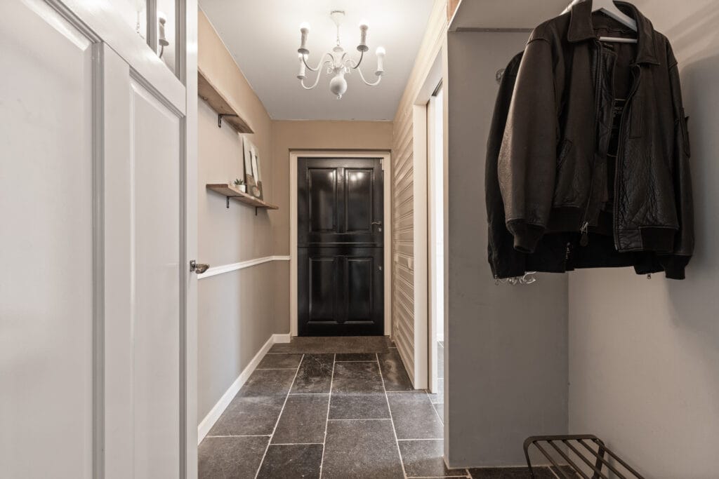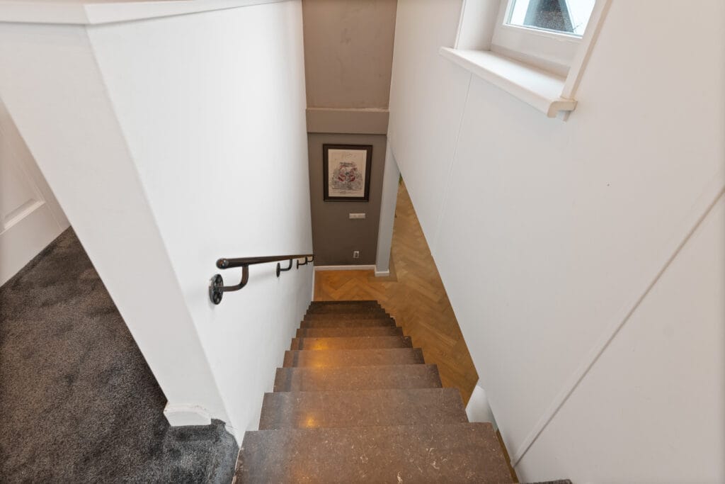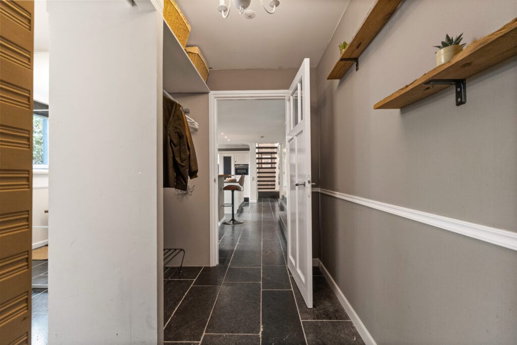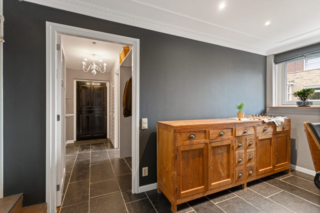 Via de entree stap je een stijlvolle hal binnen. Hier krijg je direct een indruk van het hoge afwerkingsniveau: sierlijke paneeldeuren, een prachtige klassieke radiator in gietijzer, en een separate gastentoilet. De begane grond heeft een praktische, maar ruimtelijke indeling, waarbij de verschillende ruimtes perfect in elkaar overlopen zonder afbreuk te doen aan de sfeer en privacy.