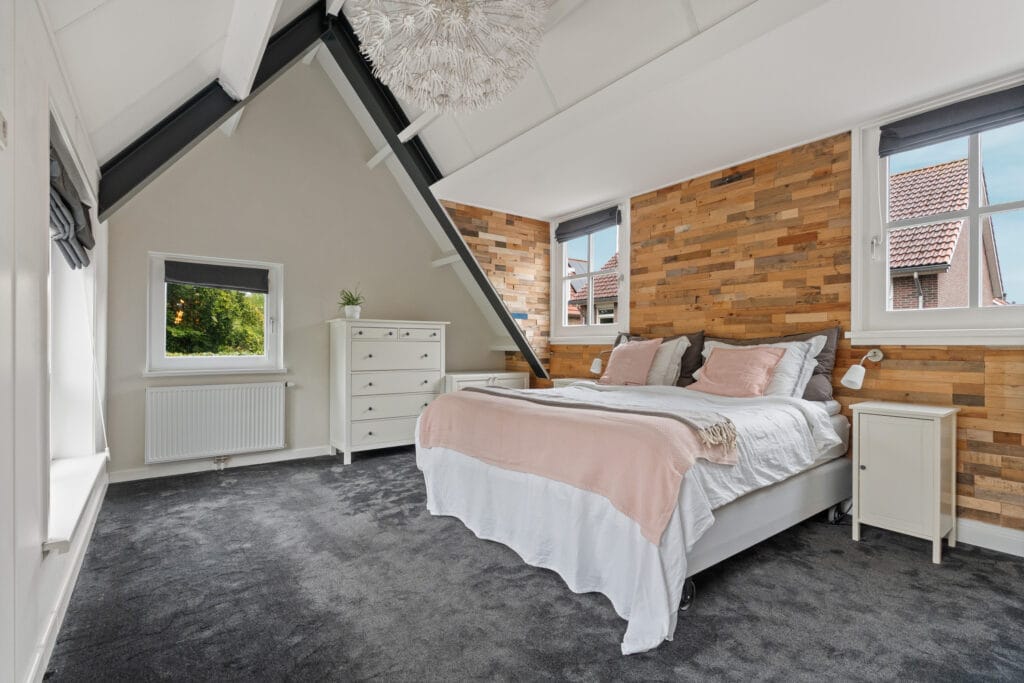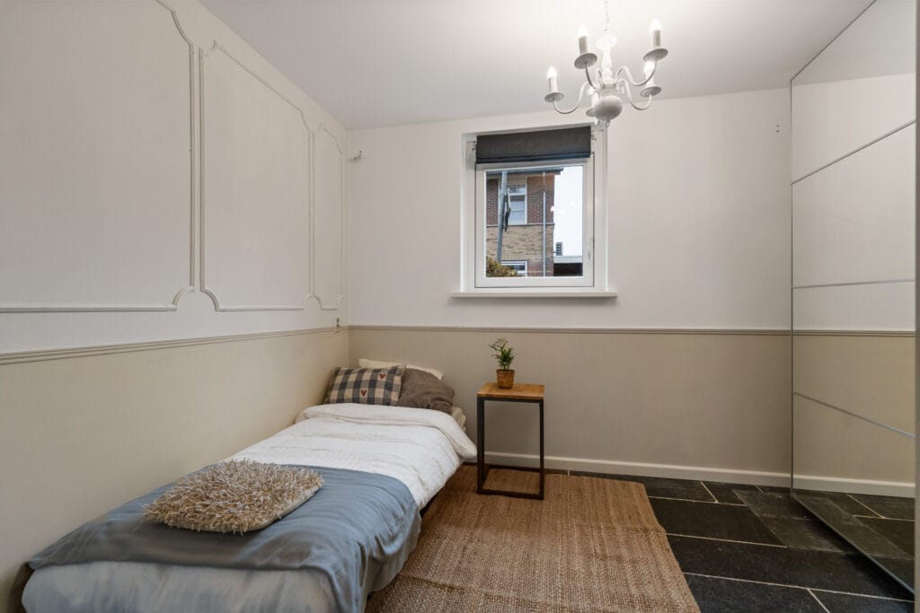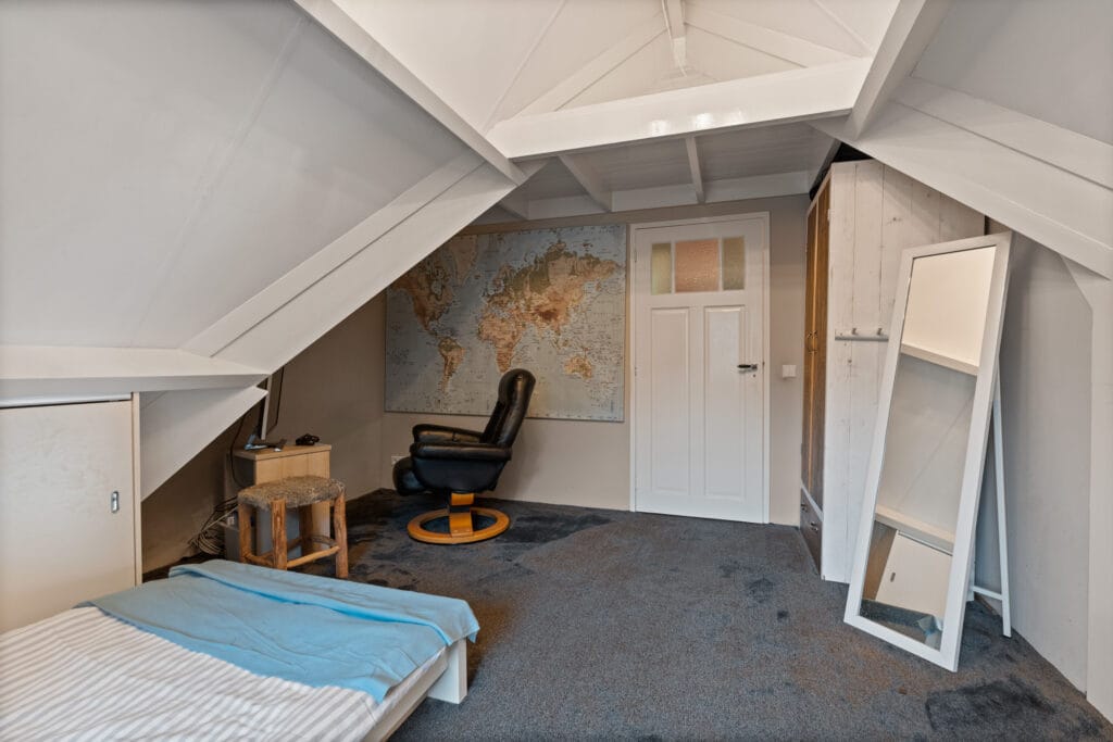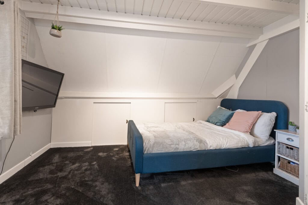 Aan de achterzijde van de woning bevindt zich een slaapkamer op de begane grond. Deze ruimte is multifunctioneel: ideaal als logeerkamer, speelruimte of thuiskantoor. Met een flexibele indeling en voldoende privacy kun je hier alle kanten mee op.