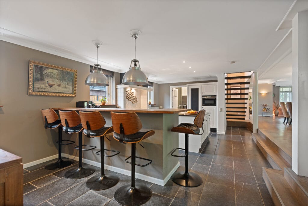 De woonkeuken is het hart van de begane grond en straalt landelijke luxe uit. Hier vind je witte houten fronten, een groot spoeleiland, een bar met plek voor 5 personen, en hoogwaardige apparatuur waaronder het Borretti gasfornuis. De vloer van de keuken, uitgevoerd in hoogwaardige leistenen tegels, sluit perfect aan bij de zwevende trap die naar boven leidt. De keukenvloer komt samen met praktische elementen zoals een bijkeuken en extra opbergruimte.