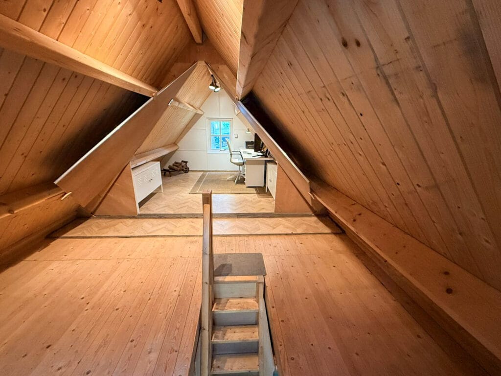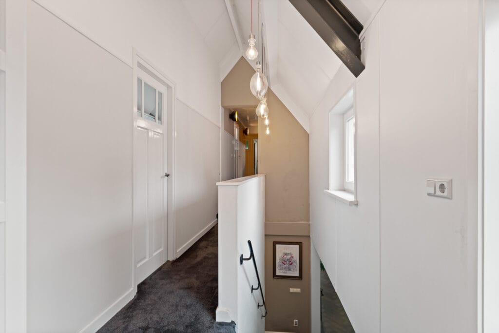 De tweede badkamer op deze verdieping is eveneens luxe ingericht, met een ligbad, aparte douche, toilet en wastafel. Verder biedt deze verdieping een praktische wasruimte en toegang tot een ruime vliering via een ladder. Overal kom je karakteristieke witte houten balken tegen, die het geheel een tijdloze uitstraling geven.