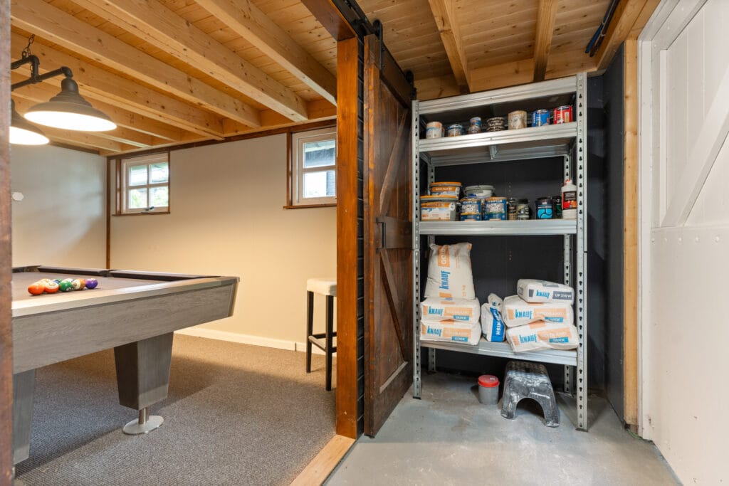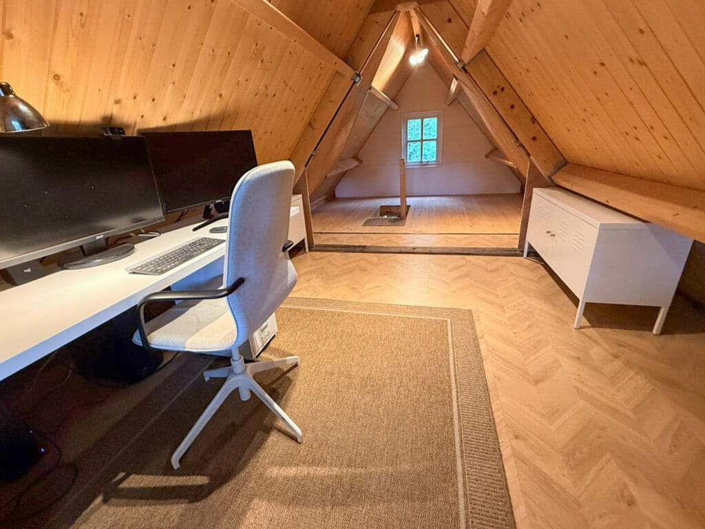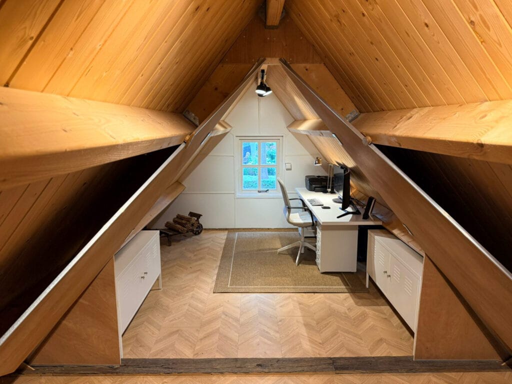 Het tweeverdiepingen tellende bijgebouw biedt ongekende mogelijkheden. Op de begane grond is ruimte voor een pooltafel, opslag en werkhoek. De bovenverdieping van 28 m² wordt momenteel gebruikt als kantoor, maar door de aansluitingen voor water, riool en internet is het eenvoudig om deze ruimte om te bouwen tot een aanleunwoning of Bed & Breakfast.