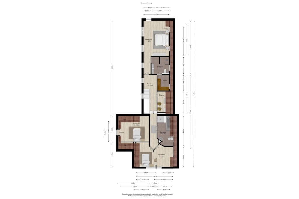 De prachtige, zwevende trap van massief leisteen brengt je naar de eerste verdieping. Hier vind je drie royale slaapkamers, elk met een eigen stijl en uitstekende indeling. De master bedroom (23 m²) heeft een en suite badkamer voorzien van dubbele wastafel, een inloopdouche, een toilet en vloerverwarming. Ook is hier je eigen privé-sauna, voor een ultiem wellnessmoment thuis. De overige twee slaapkamers zijn 18 m² en 16 m² groot, waarbij de laatste eenvoudig kan worden gesplitst in twee kleinere kamers als dat nodig is.