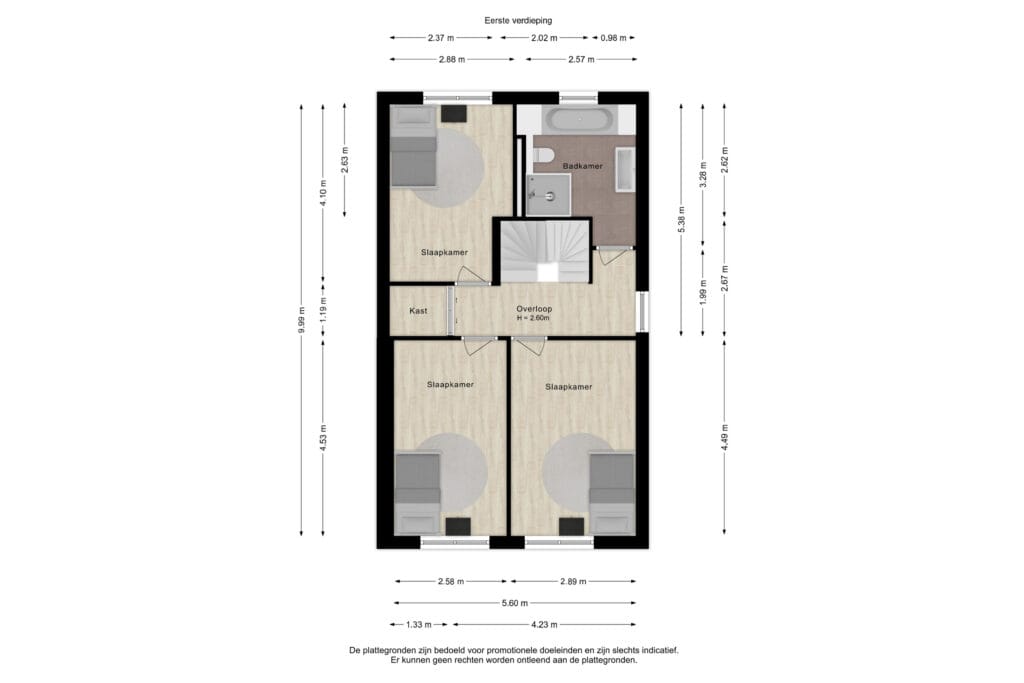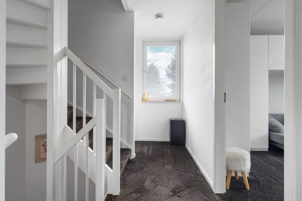 De vaste trap brengt je naar de overloop met een handige, ruime kast. Hier grenzen drie slaapkamers van respectievelijk 13, 12 en 10 m². Allemaal netjes afgewerkt en klaar voor gebruik. De badkamer is modern en functioneel, voorzien van een ligbad, douche, toilet en een wastafel met meubel. Het raam biedt natuurlijke ventilatie en een prettige lichtinval.