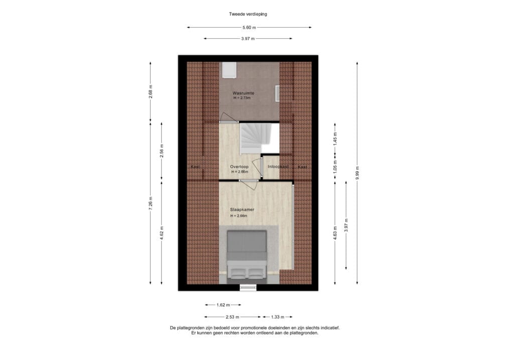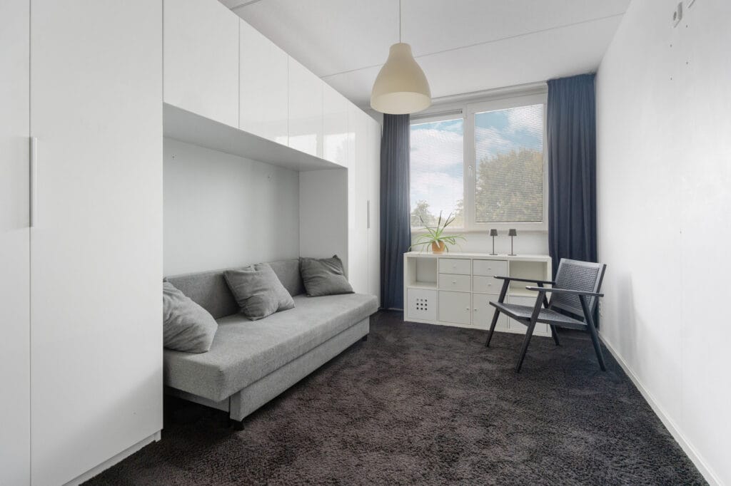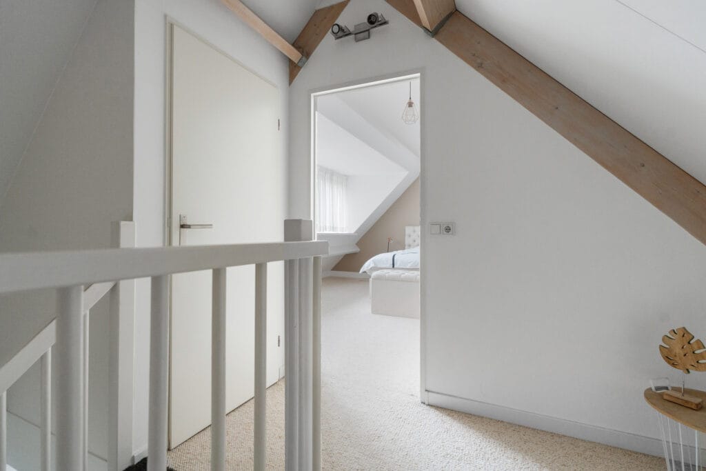 Op de tweede verdieping val je meteen voor de sfeervolle master bedroom dankzij de beige tinten, het brede dakkapel en een speels, rond raam achter het bed. Een apart wastafelmeubel maakt het extra comfortabel. Op de overloop vind je een praktische inloopkast en extra bergruimte achter de knieschotten. Aan de andere kant van de overloop is een grote wasruimte, compleet met dakraam.