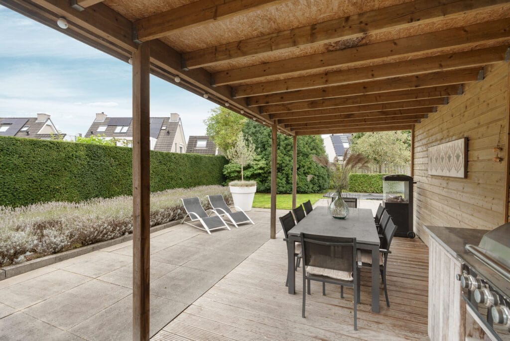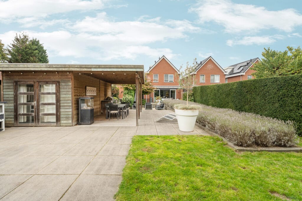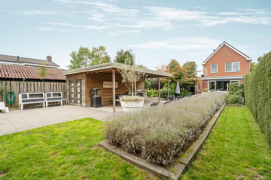 De royale achtertuin is een absolute droom. Aan de woonkeuken bevindt zich een fraaie terrasoverkapping, waar je lekker overdekt kunt zitten. Via een speels trapje naar beneden kom je op een gezellig terras omringd door groen. Halverwege de tuin bevindt zich een royale houten overkapping, compleet met een toilet, een buitenkeuken en voldoende plek voor een eettafel. Daarnaast zijn er twee aparte bergingen. De ene, kleinere berging doet dienst als tuinschuur. Het andere, geïsoleerde deel is multifunctioneel en heeft eerder gediend als kantoor, chillruimte, gastenverblijf of opslag. Deze geïsoleerde ruimte is bovendien uitgerust met een eigen toilet en fonteintje, wat zorgt voor extra gemak en flexibiliteit.