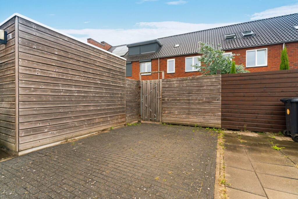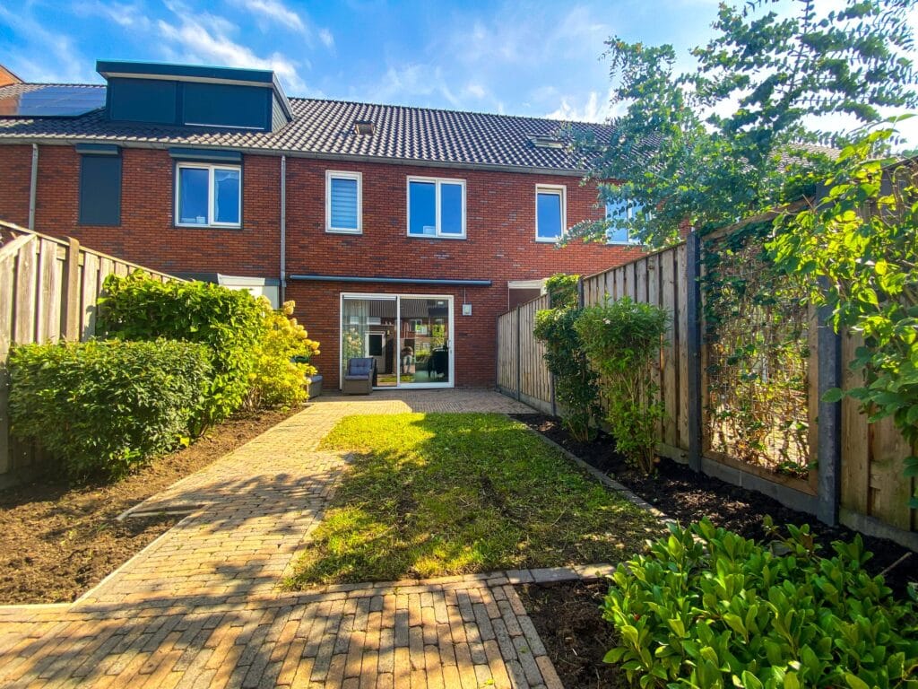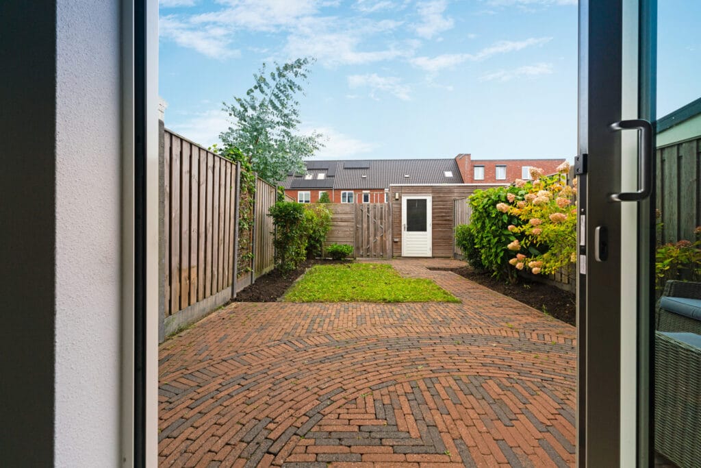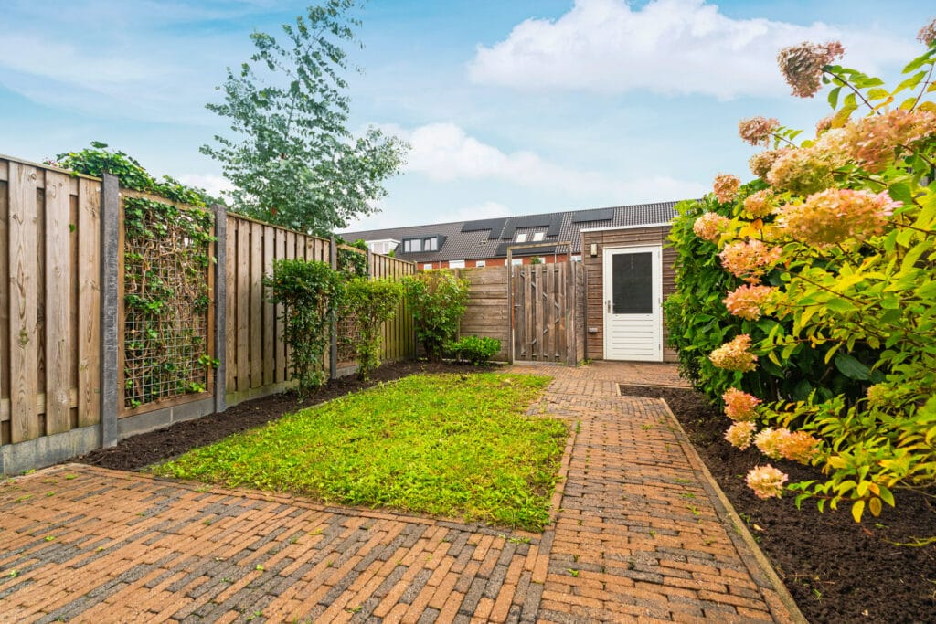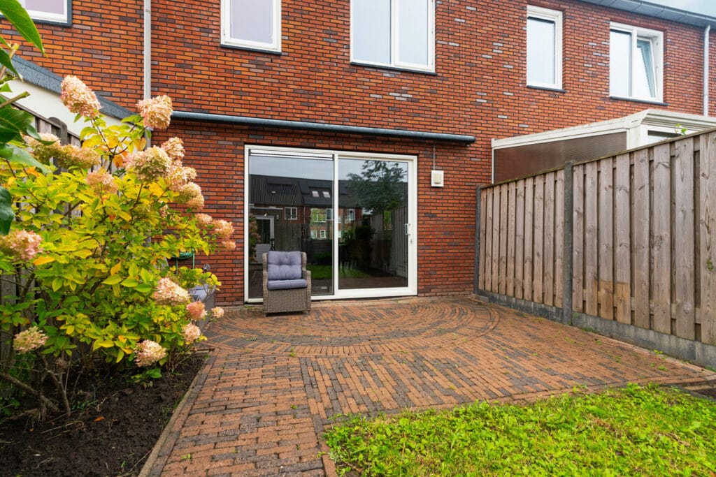 De achtertuin is een plaatje! Aangelegd met een terras van waaltjes, een strook gras, borders met o.a. hortensia’s en een nette schutting. De buitenzonwering zorgt ervoor dat je op zomerse dagen heerlijk buiten kunt genieten. Via de tuindeur loop je zo naar je eigen parkeerplaats achter de tuin. Dat is pas praktisch.