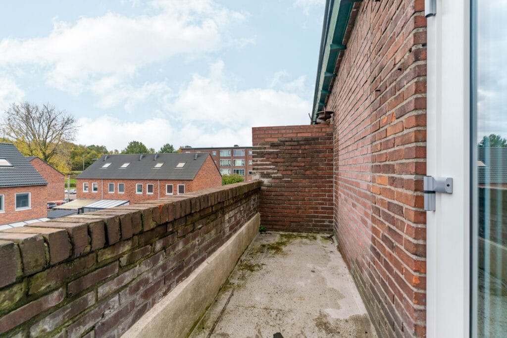 Via de trap kom je op de tweede verdieping. Hier vind je twee ruime slaapkamers en een moderne badkamer. De grootste slaapkamer heeft toegang tot een balkon, ideaal om even buiten te zitten. De tweede slaapkamer is praktisch van formaat en geschikt voor bijvoorbeeld een kinder- of werkkamer. De badkamer is modern afgewerkt en voorzien van een inloopdouche, wastafel en strak tegelwerk. Ook op deze verdieping ligt een mooie PVC-visgraatvloer, en dankzij de vloerverwarming is het comfort hier helemaal in orde.