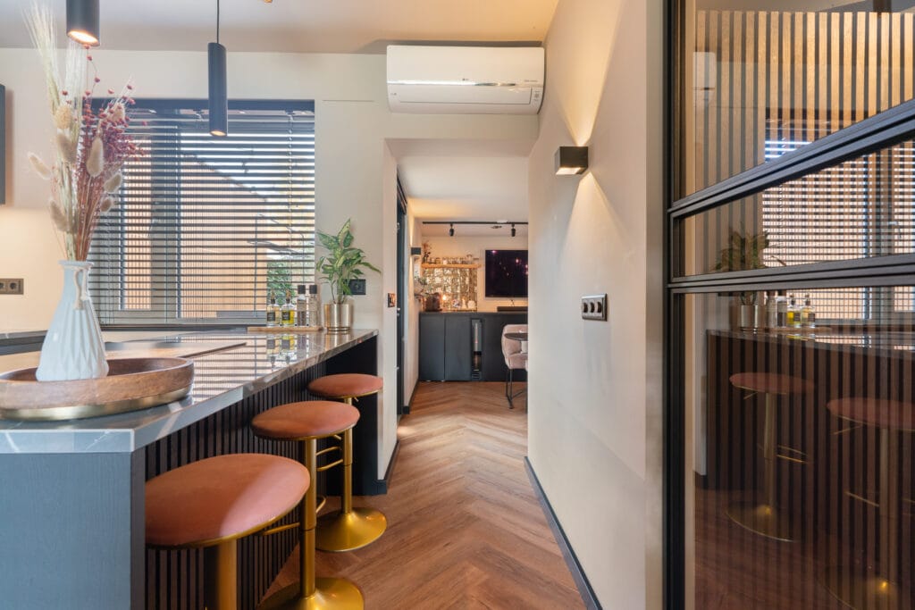 De keuken is een echte blikvanger en van alle gemakken voorzien. Het ruime kookeiland biedt niet alleen veel werkruimte, maar ook een gezellige bar waar je kunt genieten van een kop koffie of een glas wijn. Met hoogwaardige A-merk apparatuur, waaronder een inductiekookplaat met geïntegreerde afzuiging, groot combi-oven, vaatwasser en koelkast met vriesvak, is deze keuken compleet. De moderne kastfronten en het stijlvolle keramiek werkblad sluiten naadloos aan bij de luxe afwerking van de rest van de woning. Slim geplaatste rails met spotjes zorgen voor sfeervolle verlichting, waardoor deze keuken zowel praktisch als uitnodigend is – een droom voor iedere kookliefhebber! En vergeet vooral de bijkeuken niet met koffiecorner en wijnklimaatkast!