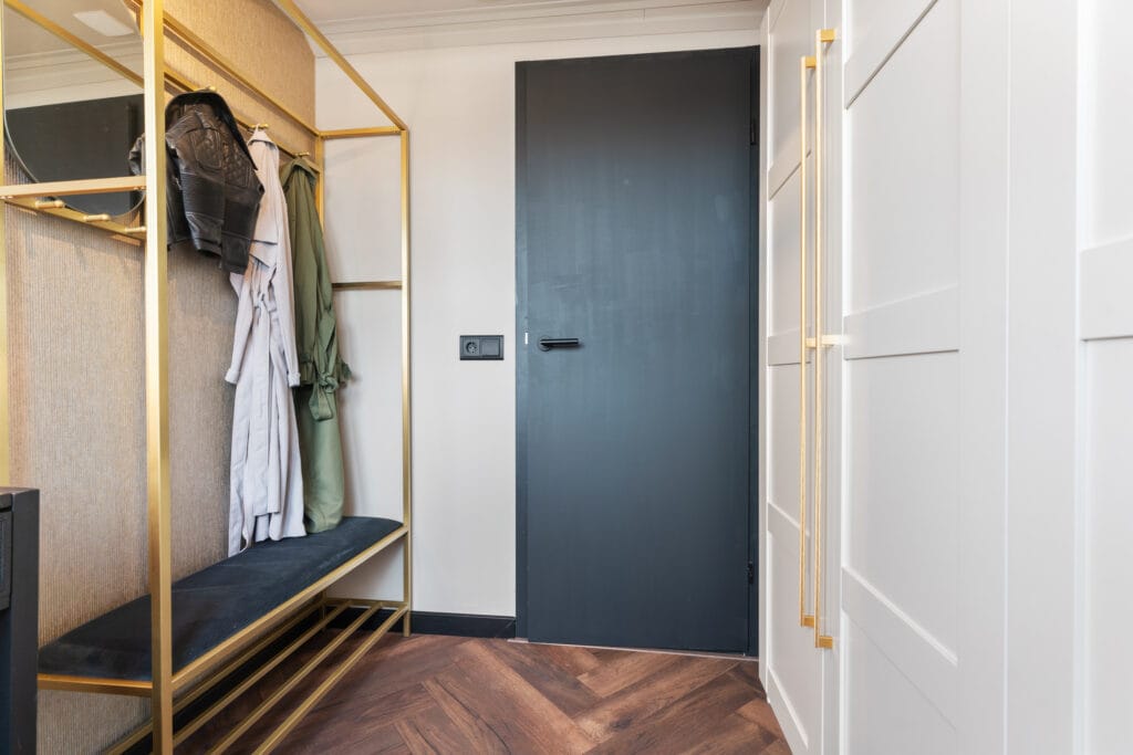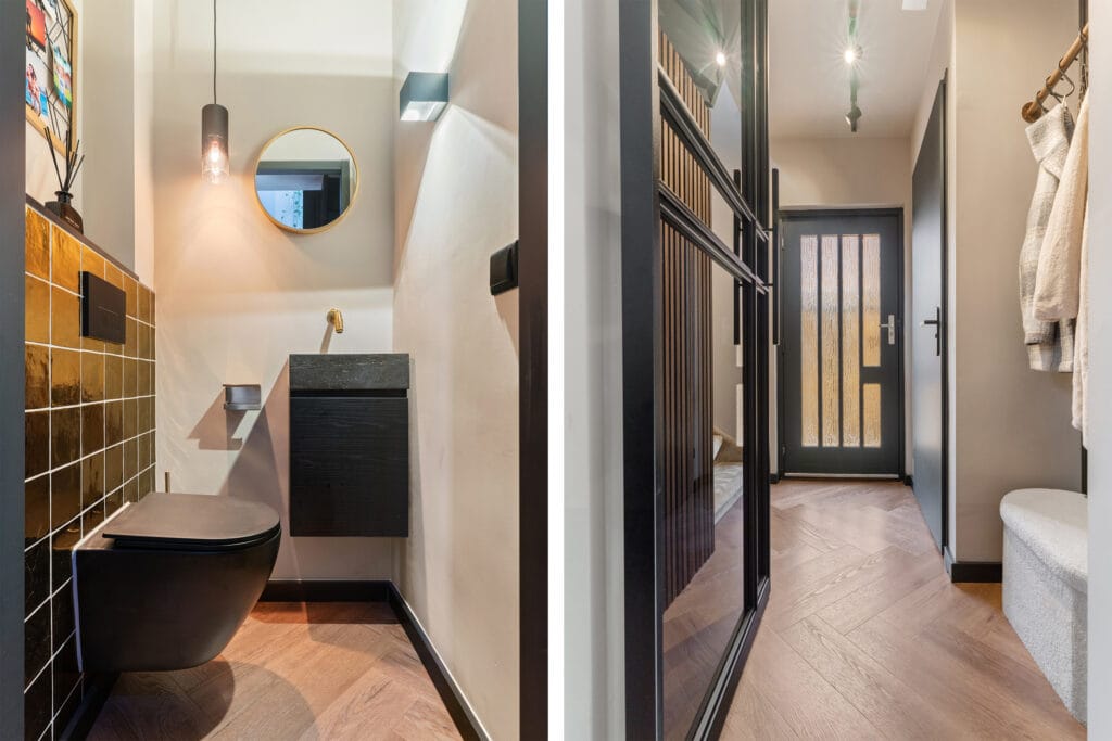Al bij aankomst wordt duidelijk hoe goed dit huis onderhouden is. De voortuin voorzien van siergrind en cortenstaal plantenbakken biedt een stijlvol visitekaartje. Via de voordeur kom je in een huis waar alles is vernieuwd. De woonkamer onderscheidt zich door strakke wanden en plafonds, een wave gordijnrail, sfeervolle railsystemen met spotjes en wandlampen. De draagbalk tussen woonkamer en keuken en de taatsdeur benadrukken de moderne stijl. Op de gehele vloer ligt een hoogwaardige, PVC-vloer met vloerverwarming en donkere plinten. Ook het toilet is meegenomen in dezelfde moderne stijl.