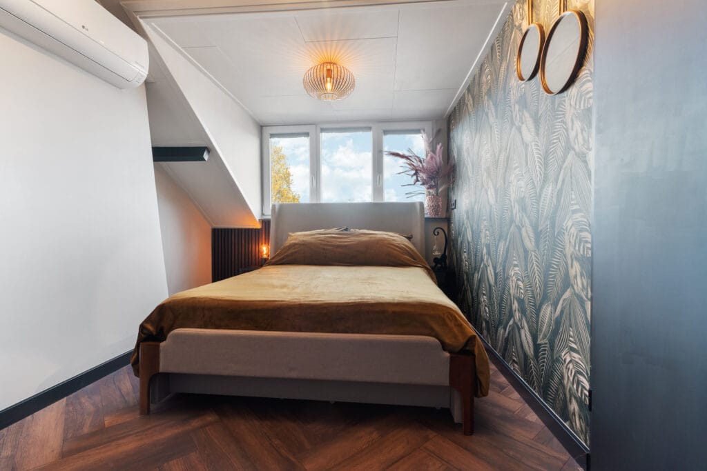 De tweede verdieping is verrassend ruim dankzij de dakkapel en biedt volop mogelijkheden. Hier vind je twee fraaie slaapkamers, waarvan de grootste met 12m² heerlijk licht en ruim is. De tweede slaapkamer, van 5m², is ideaal als bijvoorbeeld een werkplek, hobbykamer of logeerkamer. Beide kamers profiteren van het vernieuwde stucwerk en de uitstekende isolatie. Extra fijn: door de aanwezige airco is het hier, net als op de andere verdiepingen, het hele jaar door aangenaam vertoeven. Verder is er voldoende opbergruimte aanwezig achter de knieschotten, zodat alles netjes uit het zicht blijft.