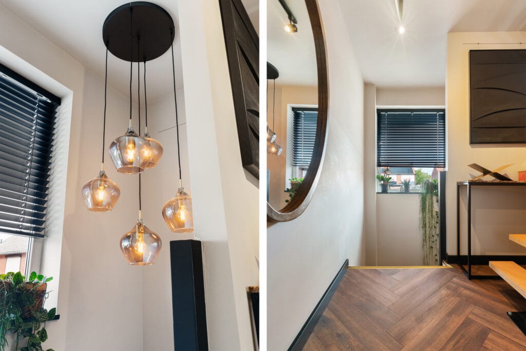 Op weg naar boven kom je sfeervolle lampen tegen boven de luxe gestoffeerde trap.