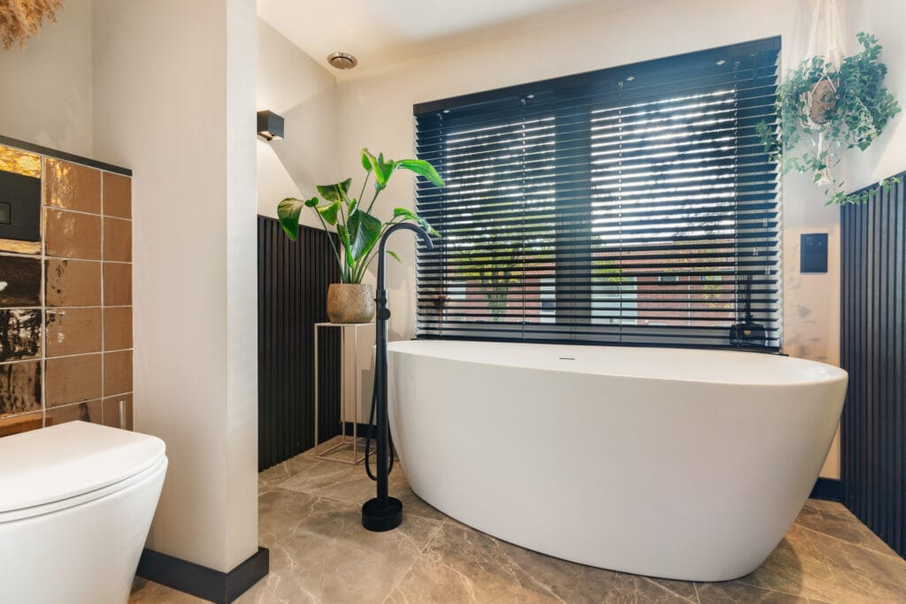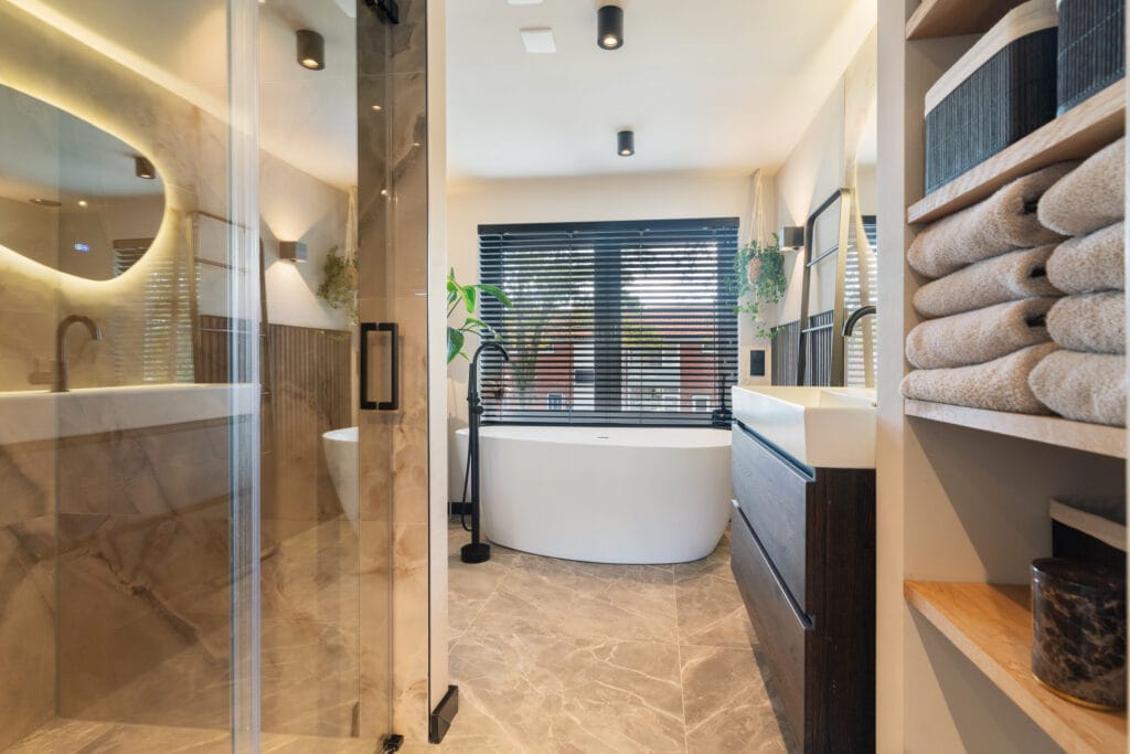De badkamer is een luxe spa-ervaring op zich. Met een vrijstaand bad, een royale inloopdouche en luxe uitstraling is het de perfecte plek om tot rust te komen.