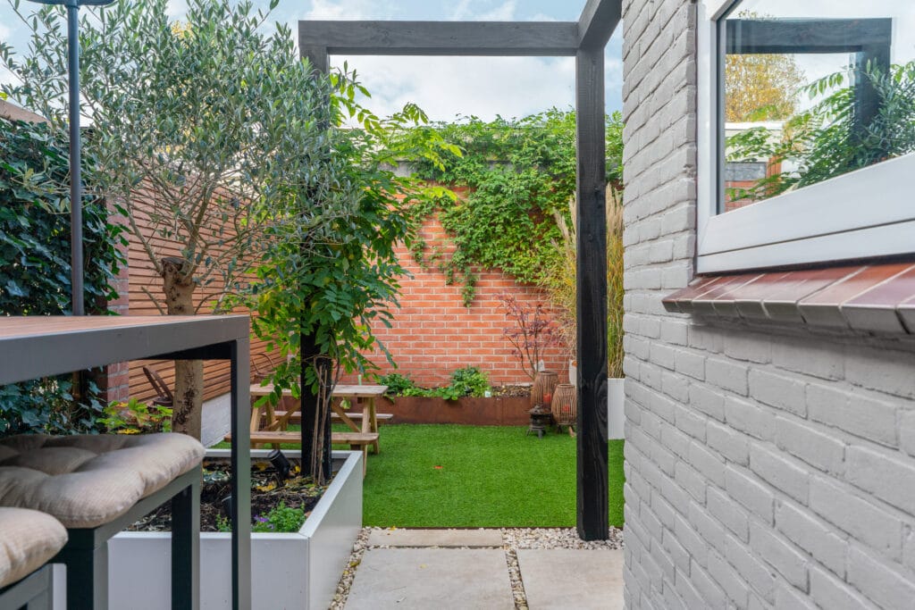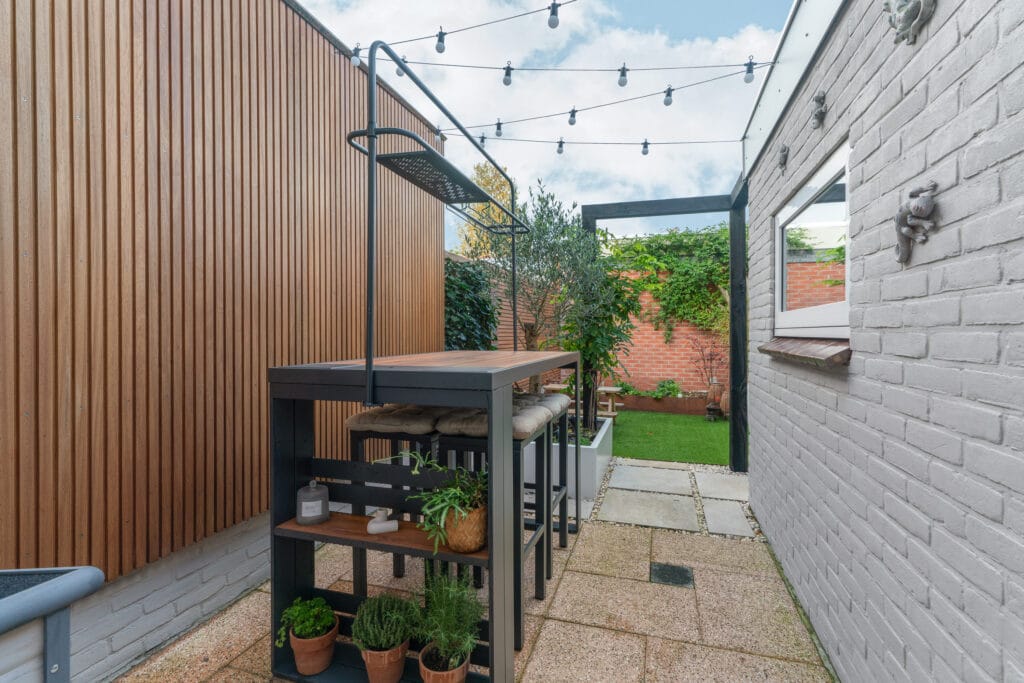 - Onderhoudsarme tuin met patio en overkapping op het westen en slimme verlichting