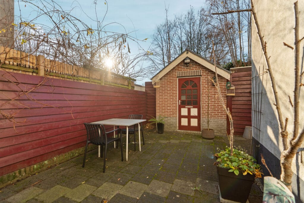 De zonnige achtertuin, op het zuidwesten gelegen, is een heerlijke plek om in alle rust buiten te genieten. Of het nu gaat om een kop koffie in de ochtendzon, een lunch in de middag of een borrel in de avondzon, hier kan het allemaal. Achterin de tuin vind je een praktische berging voor al je fietsen, gereedschap of tuinspullen, en via de handige achterom haal je de fiets zo het tuinpad op.