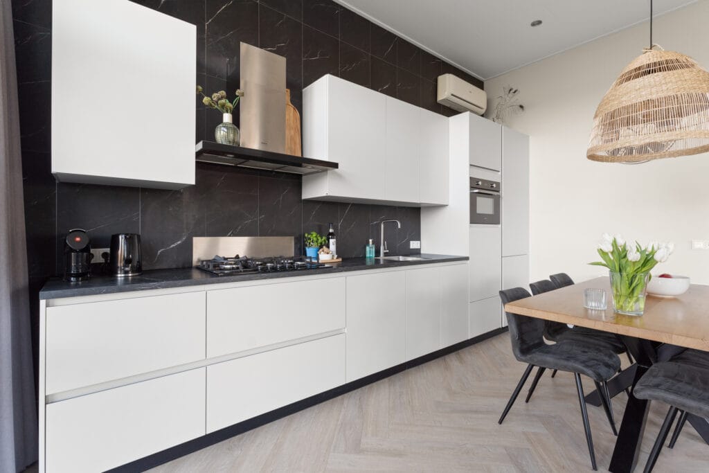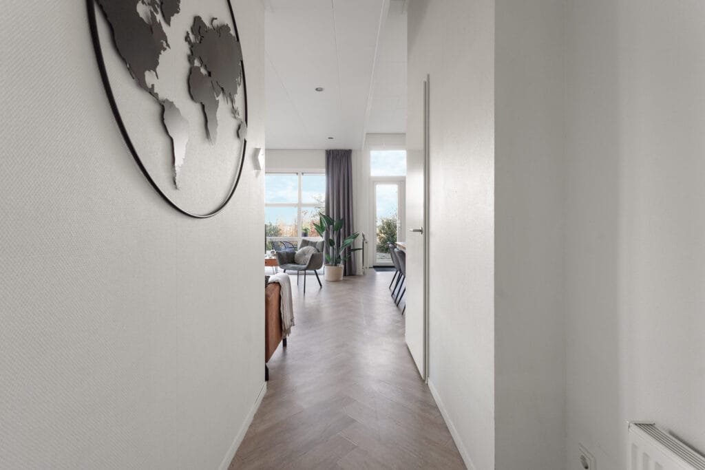 Het woongedeelte met open keuken is sfeervol en licht, met hoogwaardige meubels en een warme visgraatvloer in lichthoutkleur. De keuken is uitgevoerd met witte kastjes en een marmerlook aanrechtblad dat luxe uitstraalt en onderhoudsvriendelijk is. U beschikt over een gasfornuis, vaatwasser, koel/vries combinatie en combioven met magnetronfunctie. Via de openslaande deuren loopt u het terras op, aangelegd met een combinatie van strakke tegels en groen. In een privéhoek van het ruime perceel bevindt zich een sauna, waar u in alle rust kunt genieten van het vrije uitzicht over de omliggende landerijen.