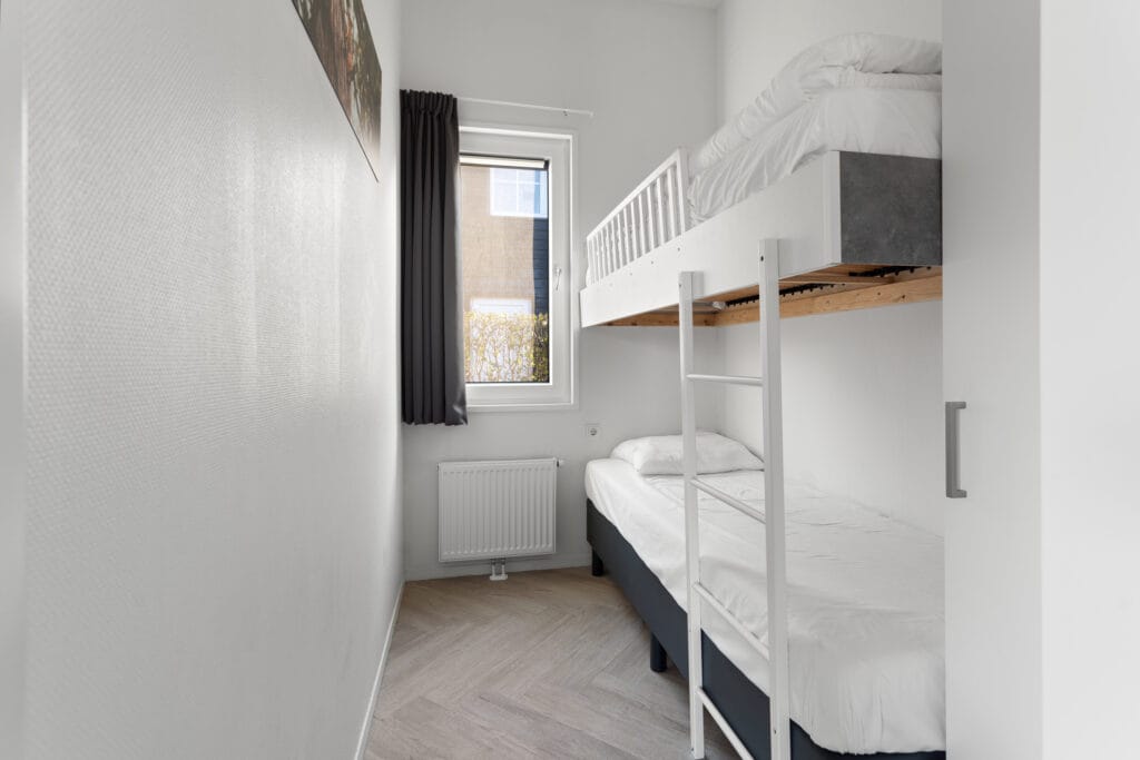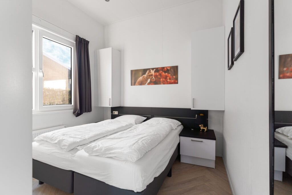 De woning beschikt over drie comfortabele slaapkamers. Eén slaapkamer is voorzien van een stapelbed, ideaal voor kinderen, de tweede slaapkamer heeft een tweepersoons boxspring die eenvoudig uit elkaar te schuiven is tot twee enkele bedden, en de masterbedroom beschikt over een tweepersoons boxspring en een en suite badkamer. Beide badkamers zijn modern en stijlvol afgewerkt in wit met warme aardetinten, voorzien van een wastafelmeubel met spiegel, toilet en ruime douchecabine. Alle slaapkamers hebben voldoende bergruimte, en bij binnenkomst treft u een ruime kast met schuifdeuren, perfect voor linnengoed en andere spullen.
